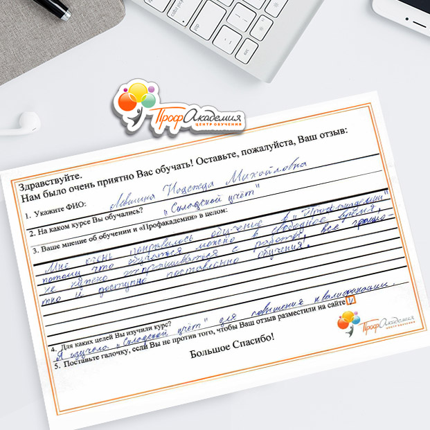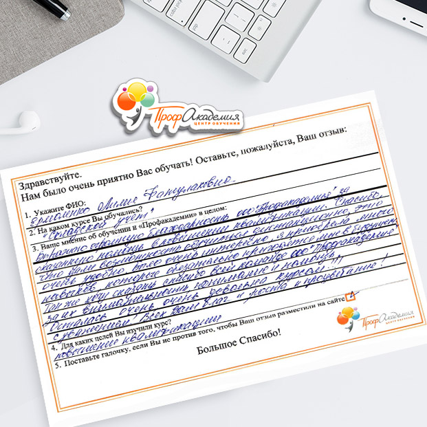 Выражаю огромную благодарность ООО «Профакадемия» за оказанную помощь в повышении квалификации. Спасибо, что дали возможность обучиться дистанционно, это очень удобно. Было очень интересно, я приобрела много навыков, которые обязательно пригодятся мне в будущем. Также хочу сказать спасибо всей команде ООО «Профакадемия» за их внимательность, понимание и помощь. Осталась очень очень довольна курсом!!! С уважением! Всех Вам благ и роста и процветания!