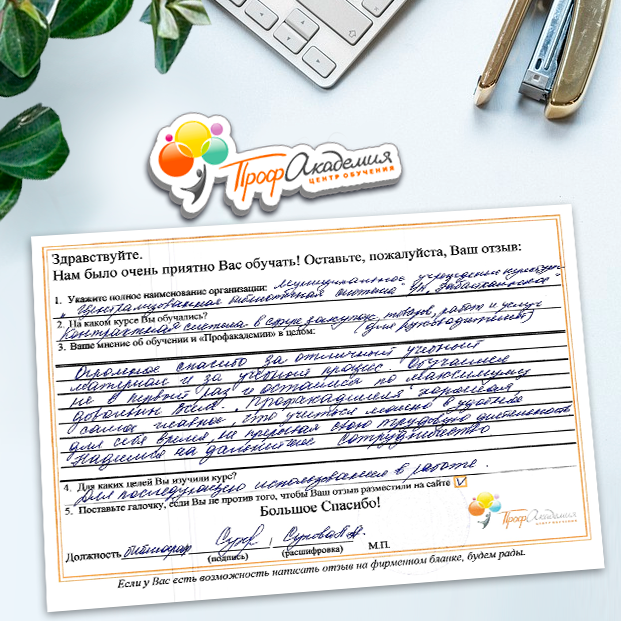 Огромное спасибо за отличный учебный материал и за учебный процесс. Обучаемся не в первый раз и остаемся по максимуму довольными всем. "Профакадемия" хорошая, самое главное, что учиться можно в удобное для себя время, не прерывая свою трудовую деятельность. Надеемся на дальнейшее сотрудничество.