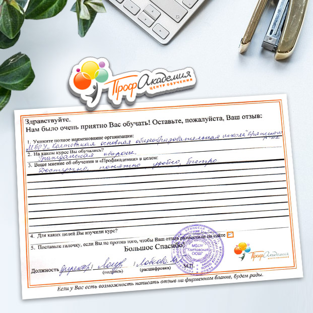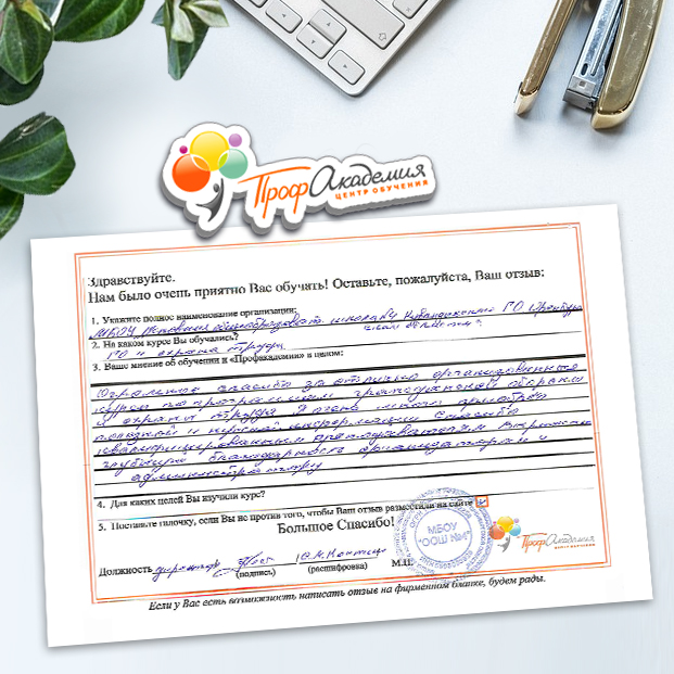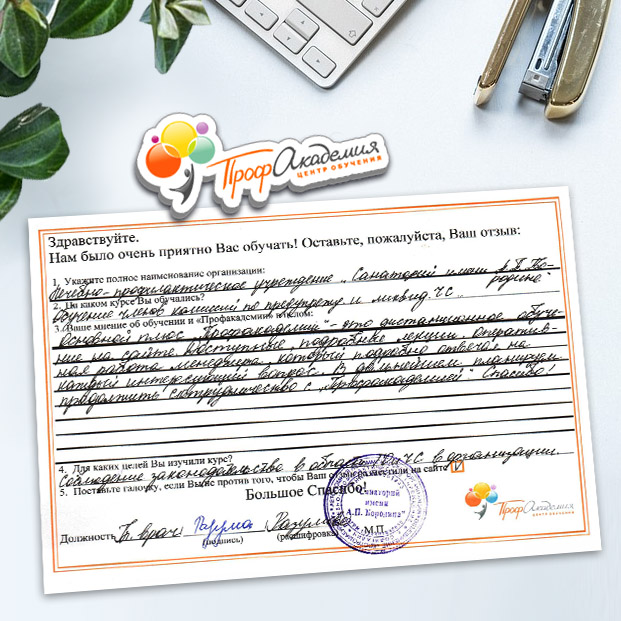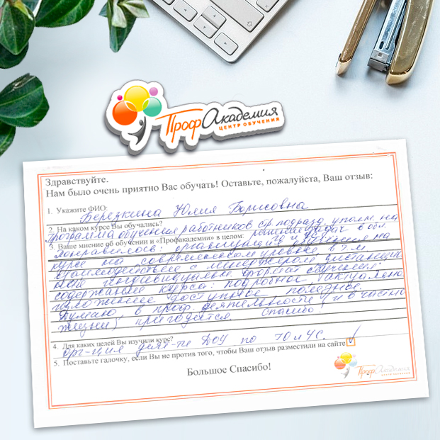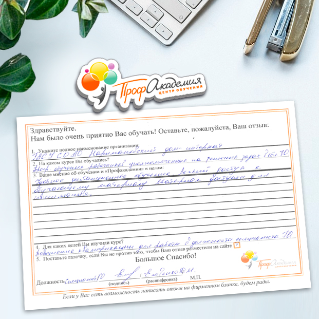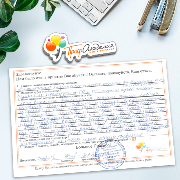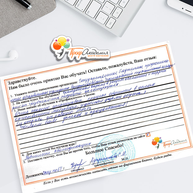 Огромное спасибо, всей команде “Профакадемии”, очень слаженная работа, быстро удобно, познавательно, есть время сделать заметки и разобраться в вопросах, узнать больше! Работаем уже несколько лет с Вами и очень довольны!!! Относитесь внимательно к любому клиенту, даже если обучается один человек, очень приятно! Спасибо всем! Процветания и стабильности