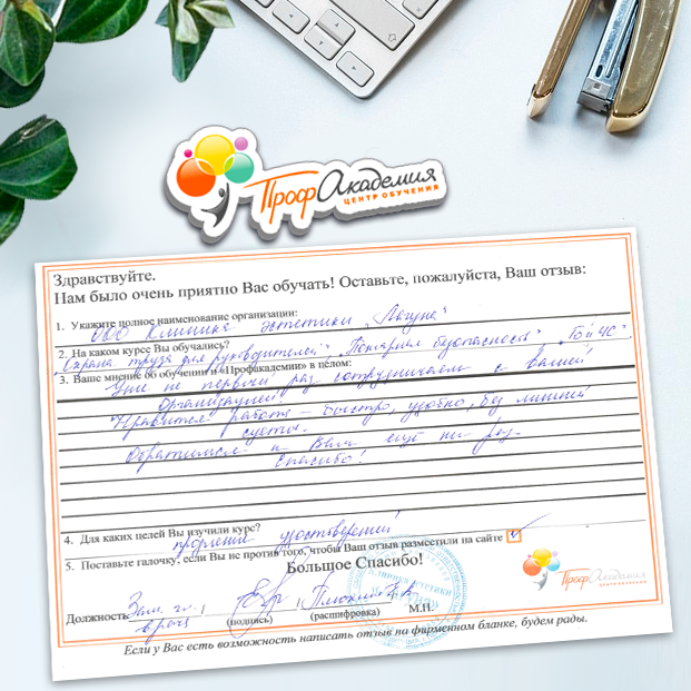 Для прохождения доп. проф. образ. для руководителя обращаемся в ПрофАкадемию почти 10 лет. Хотим отметить высокий профессионализм сотрудников, доброжелательность и надежность. Команда работает качественно, без задержек и накладок. Спасибо за ваш труд! Успехов и процветания!