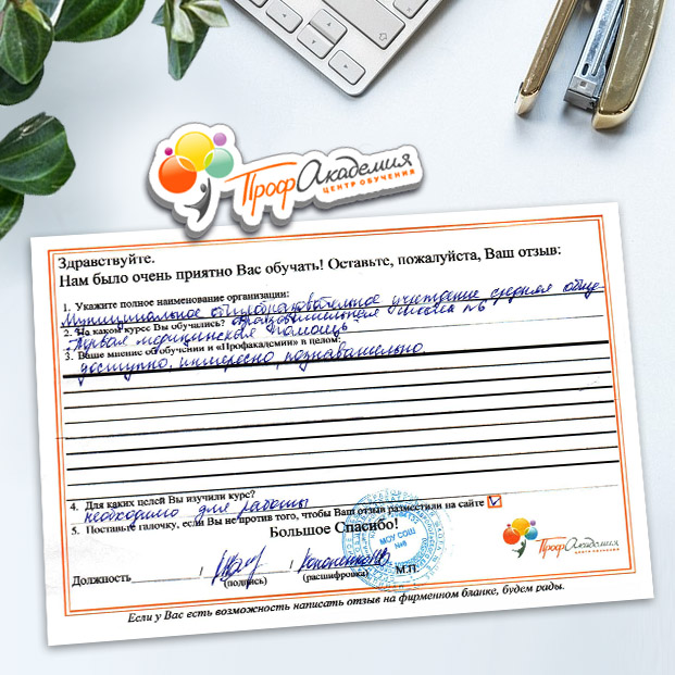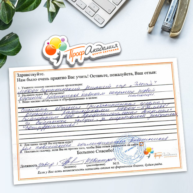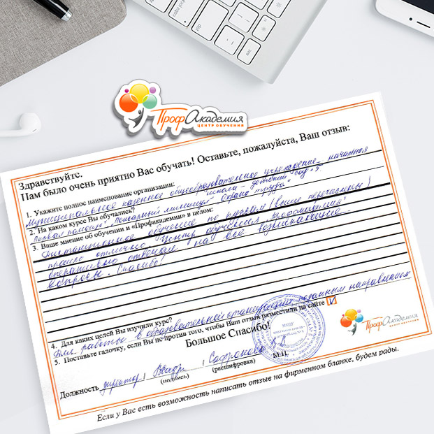 Хочется выразить огромную благодарность ООО "Профессиональная академия" за предоставления образовательной услуги. Особое спасибо специалисту по работе с клиентами Аликбаеву Николаю Ураловичу. Приятно было работать с хорошо знающим свое дело специалистом.