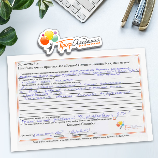 Система обучения (дистанционная форма) оценена работниками МБДОУ - 5 баллов! Благодарим ООО "Профессиональная Академия" за оказанные услуги, за оперативность, доступность, сотрудничество!