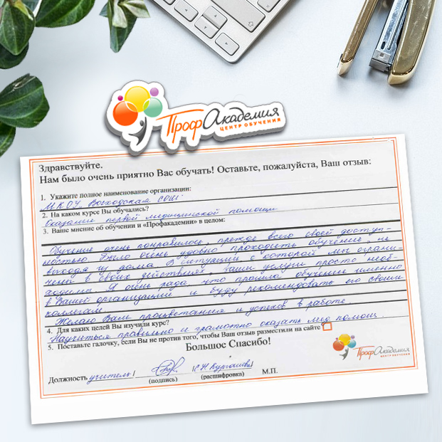 Дистанционное обучение по курсам первая помощь в образовательной организации прошло отлично. Центр обучения «Профакадемия» оперативно отвечал на все возникающие вопросы. Спасибо!